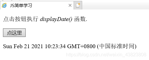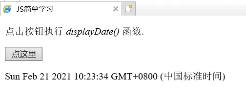 <!DOCTYPE html> <html lang="en"> <head> <meta charset="utf-8"> <title>JS简单学习</title> </head> <body> <p>点击按钮执行 <em>displayDate()</em> 函数.</p> <button type="button" id="myBtn">点这里</button> <script> function displayDate() { document.getElementById("demo").innerHTML=Date(); } document.getElementById("myBtn").onclick=function(){displayDate()}; </script> <p id="demo"></p> </body> </html>
