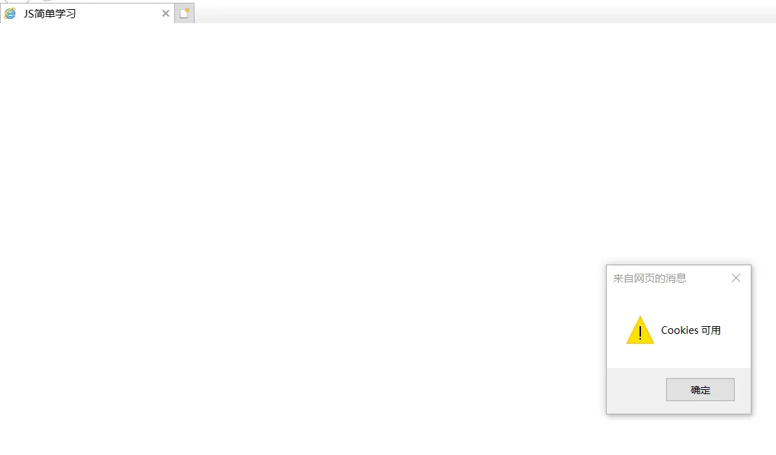 <!DOCTYPE html> <html lang="en"> <head> <meta charset="utf-8"> <title>JS简单学习</title> </head> <body onload="checkCookies()"> <script> function checkCookies() { if(navigator.cookieEnabled==true) { alert("Cookies 可用"); }else { alert("Cookies 不可用"); } } </script> <p>弹窗-提示浏览器 cookie 是否可用。</p> </body> </html>