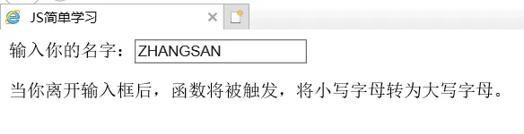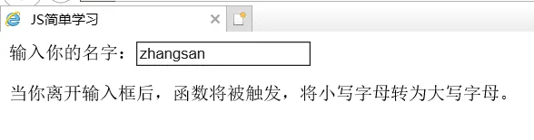 <!DOCTYPE html> <html lang="en"> <head> <meta charset="utf-8"> <title>JS简单学习</title> </head> <body> 输入你的名字:<input type="text" id="yourname" onchange="myFunction()" /> <p>当你离开输入框后,函数将被触发,将小写字母转为大写字母。</p> <script> function myFunction() { var str=document.getElementById("yourname"); str.value=str.value.toUpperCase(); } </script> </body> </html>