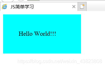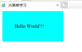 <!DOCTYPE html> <html lang="en"> <head> <meta charset="utf-8"> <title>JS简单学习</title> <style type="text/css"> div { background-color: aqua; width: 120px; height: 20px; padding: 40px; } </style> </head> <body> <div onmouseover="mOver(this)" onmouseout="mOut(this)">Hello World!!!</div> <script> function mOver(obj) { obj.innerHTML="JavaScript!!!"; } function mOut(obj) { obj.innerHTML="Hello World!!!"; } </script> </body> </html>