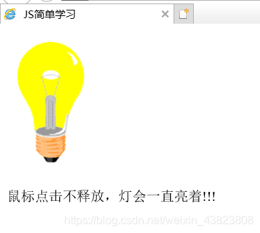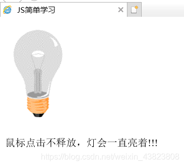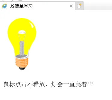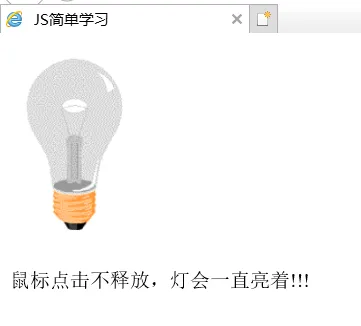 <!DOCTYPE html> <html lang="en"> <head> <meta charset="utf-8"> <title>JS简单学习</title> </head> <body> <img id="myimage" onmousedown="lighton()" onmouseup="lightoff()" src="img/img/close.png" width="100" height="160" /> <p>鼠标点击不释放,灯会一直亮着!!!</p> <script> function lighton() { document.getElementById("myimage").src="img/img/open.png"; } function lightoff() { document.getElementById("myimage").src="img/img/close.png"; } </script> </body> </html>
