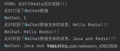 package MyRedis; import redis.clients.jedis.Jedis; import redis.clients.jedis.JedisPubSub; public class Main { public static void main(String[] args) { Jedis jedis=new Jedis("127.0.0.1",6379); System.out.println(jedis.ping() + ":此时与Redis成功连接!!!"); //订阅WeChat频道 JedisUtil.subscribeMessage("WeChat"); /* 这里肯定是先订阅频道,之后才可以向该频道发布消息,也即发布在订阅之后 所以这里调用Thread类的sleep()方法先睡眠200ms,之后再进行发布 */ try { Thread.sleep(200); }catch (InterruptedException e) { e.printStackTrace(); }finally { // } JedisUtil.publishMessage("WeChat","Hello Redis!!!"); JedisUtil.publishMessage("WeChat","Java and Redis!!!"); } }