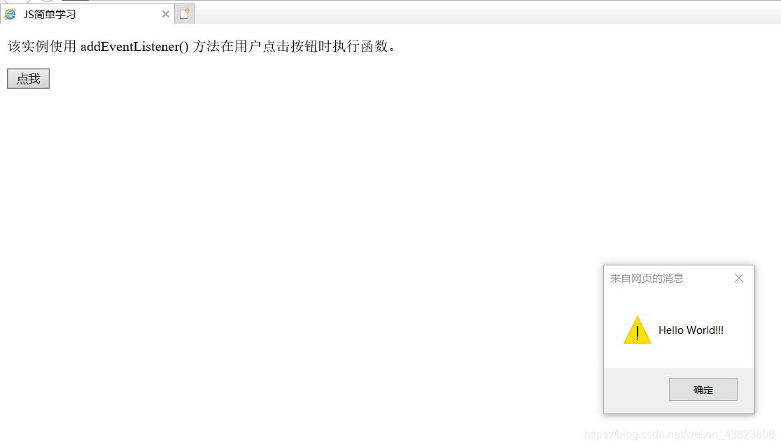 <!DOCTYPE html> <html lang="en"> <head> <meta charset="utf-8" /> <title>JS简单学习</title> </head> <body> <p>该实例使用 addEventListener() 方法在用户点击按钮时执行函数。</p> <button type="button" id="myBtn">点我</button> <script> document.getElementById("myBtn").addEventListener("click",myFunction); function myFunction() { alert("Hello World!!!"); } </script> </body> </html>