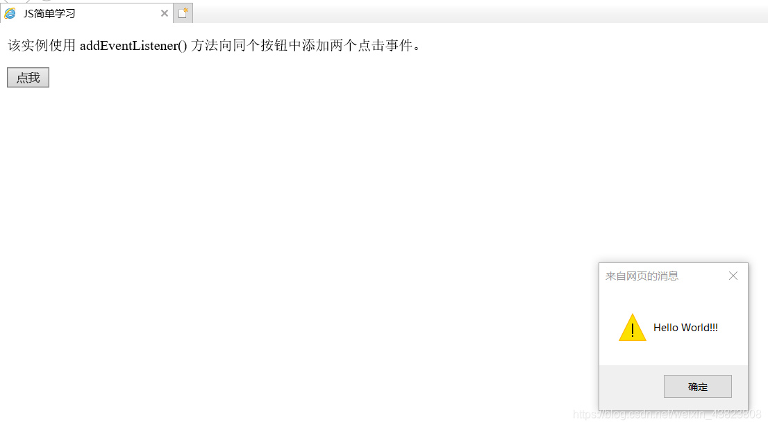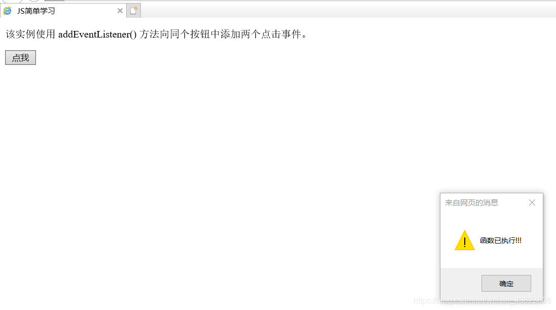 <!DOCTYPE html> <html lang="en"> <head> <meta charset="utf-8" /> <title>JS简单学习</title> </head> <body> <p>该实例使用 addEventListener() 方法向同个按钮中添加两个点击事件。</p> <button type="button" id="myBtn">点我</button> <script type="text/javascript"> var x=document.getElementById("myBtn"); x.addEventListener("click",myFunction); x.addEventListener("click",someOtherFunction); function myFunction() { alert("Hello World!!!"); } function someOtherFunction() { alert("函数已执行!!!"); } </script> </body> </html>