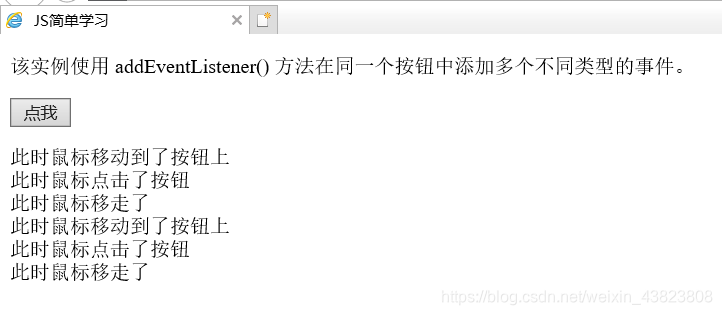 <!DOCTYPE html> <html lang="en"> <head> <meta charset="utf-8"> <title>JS简单学习</title> </head> <body> <p>该实例使用 addEventListener() 方法在同一个按钮中添加多个不同类型的事件。</p> <button type="button" id="myBtn">点我</button> <p id="demo"></p> <script type="text/javascript"> var x=document.getElementById("myBtn"); x.addEventListener("mouseover",myFirstFunction); x.addEventListener("click",mySecondFunction); x.addEventListener("mouseout",myThirdFunction); function myFirstFunction() { document.getElementById("demo").innerHTML +="此时鼠标移动到了按钮上" + "<br />"; } function mySecondFunction() { document.getElementById("demo").innerHTML +="此时鼠标点击了按钮" + "<br />"; } function myThirdFunction() { document.getElementById("demo").innerHTML +="此时鼠标移走了" + "<br />"; } </script> </body> </html>