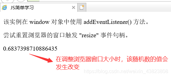 <!DOCTYPE html> <html lang="en"> <head> <meta charset="utf-8"> <title>JS简单学习</title> </head> <body> <p>该实例在 window 对象中使用 addEventListener() 方法。</p> <p>尝试重置浏览器的窗口触发 "resize" 事件句柄。</p> <p id="demo"></p> <script type="text/javascript"> window.addEventListener("resize",function(){ document.getElementById("demo").innerHTML=Math.random(); }); </script> </body> </html>
