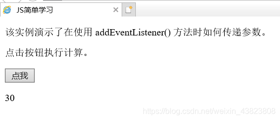 <!DOCTYPE html> <html lang="en"> <head> <meta charset="utf-8"> <title>JS简单学习</title> </head> <body> <p>该实例演示了在使用 addEventListener() 方法时如何传递参数。</p> <p>点击按钮执行计算。</p> <button type="button" id="myBtn">点我</button> <p id="demo"></p> <script type="text/javascript"> var x=5,y=6; document.getElementById("myBtn").addEventListener("click",function(){ myFunction(x,y); }); function myFunction(a,b) { var ans=a*b; document.getElementById("demo").innerHTML=ans; } </script> </body> </html>
