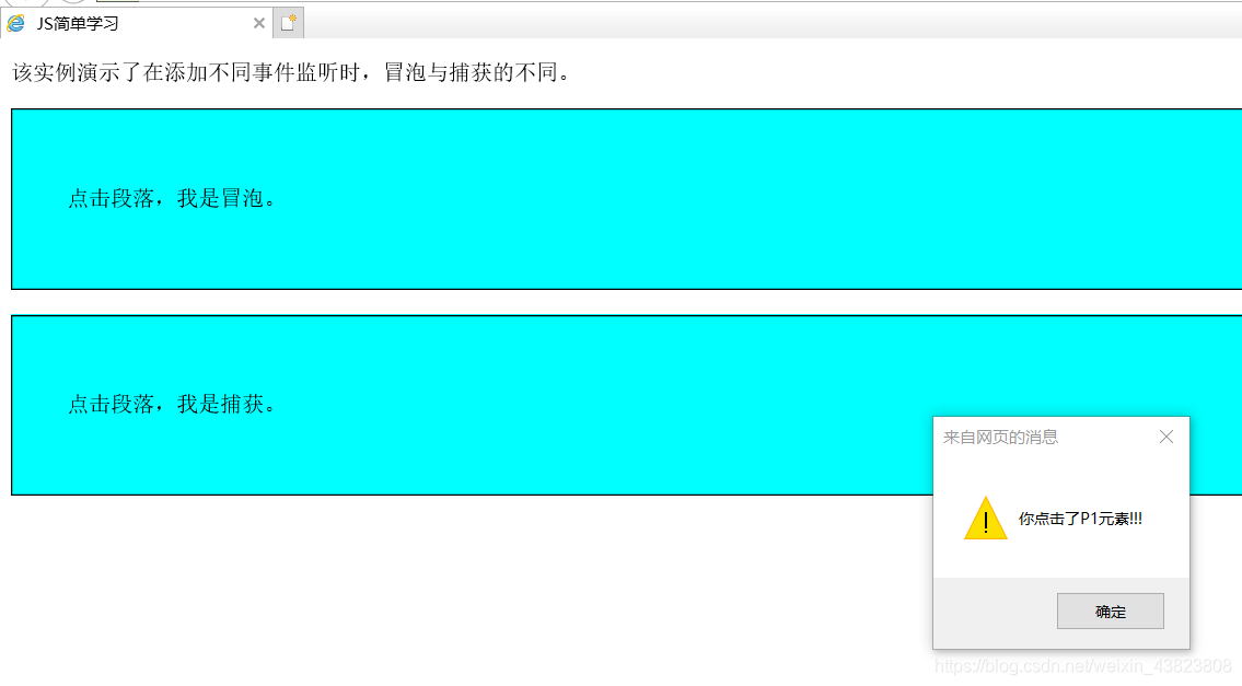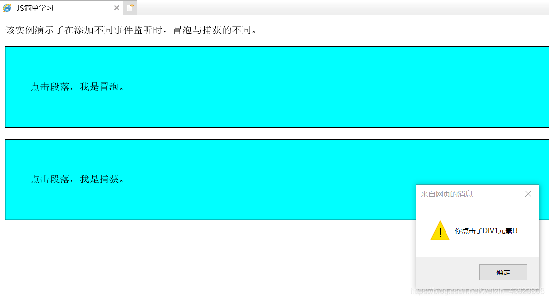 <!DOCTYPE html> <html lang="en"> <head> <meta charset="utf-8"> <title>JS简单学习</title> <style type="text/css"> div { border: 1px solid black; padding: 40px; background-color: aqua; } </style> </head> <body> <p>该实例演示了在添加不同事件监听时,冒泡与捕获的不同。</p> <div id="myDiv1"> <p id="myP1">点击段落,我是冒泡。</p> </div><br /> <div id="myDiv2"> <p id="myP2">点击段落,我是捕获。</p> </div> <script type="text/javascript"> document.getElementById("myP1").addEventListener("click",function() { alert("你点击了P1元素!!!"); },false); document.getElementById("myDiv1").addEventListener("click",function() { alert("你点击了DIV1元素!!!"); },false); document.getElementById("myP2").addEventListener("click",function() { alert("你点击了P2元素!!!"); },true); document.getElementById("myDiv2").addEventListener("click",function() { alert("你点击了DIV2元素!!!"); },true); </script> </body> </html>