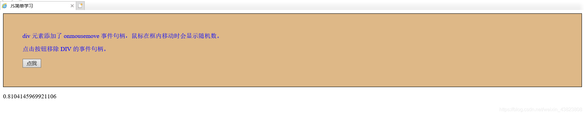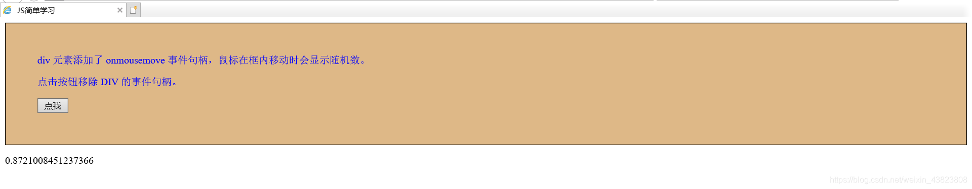 <!DOCTYPE html> <html lang="en"> <head> <meta charset="utf-8"> <title>JS简单学习</title> <style type="text/css"> #myDIV { border: 1px solid black; padding: 50px; background-color: burlywood; color: blue; } </style> </head> <body> <div id="myDIV"> div 元素添加了 onmousemove 事件句柄,鼠标在框内移动时会显示随机数。 <p>点击按钮移除 DIV 的事件句柄。</p> <button type="button" onclick="removeHandler()" id="myBtn">点我</button> </div> <p id="demo"></p> <script type="text/javascript"> document.getElementById("myDIV").addEventListener("mousemove",myFunction); function myFunction() { document.getElementById("demo").innerHTML=Math.random(); } function removeHandler() { document.getElementById("myDIV").removeEventListener("mousemove",myFunction); } </script> </body> </html>
