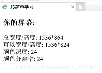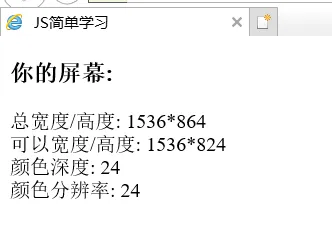 <!DOCTYPE html> <html lang="en"> <head> <meta charset="utf-8" /> <title>JS简单学习</title> </head> <body> <h3>你的屏幕:</h3> <script type="text/javascript"> document.write("总宽度/高度: "); document.write(screen.width + "*" + screen.height); document.write("<br />"); document.write("可以宽度/高度: "); document.write(screen.availWidth + "*" + screen.availHeight); document.write("<br />"); document.write("颜色深度: "); document.write(screen.colorDepth); document.write("<br />"); document.write("颜色分辨率: "); document.write(screen.pixelDepth); </script> </body> </html>