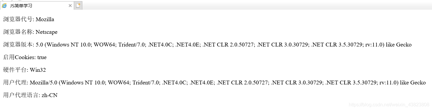<!DOCTYPE html> <html lang="en"> <head> <meta charset="utf-8"> <title>JS简单学习</title> </head> <body> <div id="example"></div> <script type="text/javascript"> txt = "<p>浏览器代号: " + navigator.appCodeName + "</p>"; txt+= "<p>浏览器名称: " + navigator.appName + "</p>"; txt+= "<p>浏览器版本: " + navigator.appVersion + "</p>"; txt+= "<p>启用Cookies: " + navigator.cookieEnabled + "</p>"; txt+= "<p>硬件平台: " + navigator.platform + "</p>"; txt+= "<p>用户代理: " + navigator.userAgent + "</p>"; txt+= "<p>用户代理语言: " + navigator.language + "</p>"; document.getElementById("example").innerHTML=txt; </script> </body> </html>