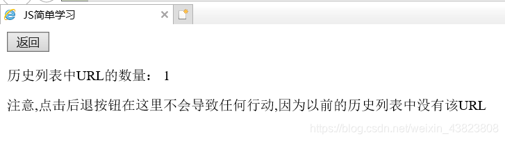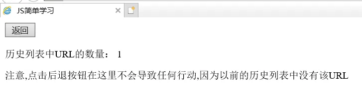 <!DOCTYPE html> <html lang="en"> <head> <meta charset="utf-8"> <title>JS简单学习</title> </head> <body> <input type="button" value="返回" onclick="goBack()" /> <br /><br /> <script type="text/javascript"> function goBack() { window.history.back(); } document.write("历史列表中URL的数量: " + history.length); </script> <p>注意,点击后退按钮在这里不会导致任何行动,因为以前的历史列表中没有该URL</p> </body> </html>