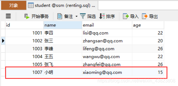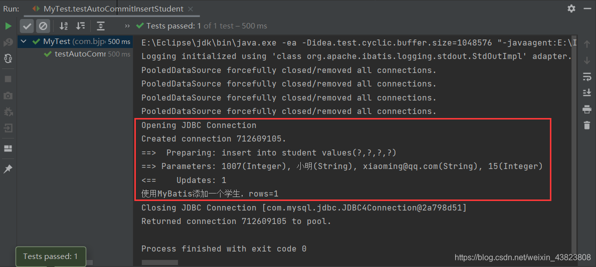 //测试MyBatis执行sql语句 @Test public void testAutoCommitInsertStudent() throws IOException { String config="mybatis.xml"; InputStream inputStream=Resources.getResourceAsStream(config); SqlSessionFactory factory=new SqlSessionFactoryBuilder().build(inputStream); //openSession(true):创建一个有自动提交功能的 SqlSession //openSession(false):创建一个非自动提交功能的 SqlSession,需手动提交 //openSession():同 openSession(false) SqlSession session=factory.openSession(true); String sqlId="com.bjpowernode.dao.StudentDao" + "." + "insertStudent"; Student student=new Student(); student.setId(1007); student.setName("小明"); student.setEmail("xiaoming@qq.com"); student.setAge(15); int rows=session.insert(sqlId,student); System.out.println("使用MyBatis添加一个学生,rows=" + rows); session.close(); }