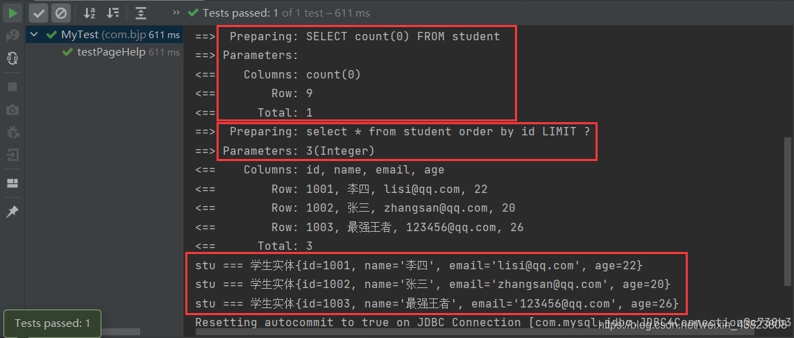 @Test public void testPageHelper() { SqlSession session = MyBatisUtil.getSqlSession(); StudentDao studentDao=session.getMapper(StudentDao.class); //调用PageHelper的方法 PageHelper.startPage(1,3); List<Student> students=studentDao.selectAllStudent(); students.forEach( stu-> System.out.println("stu === " + stu)); session.close(); }