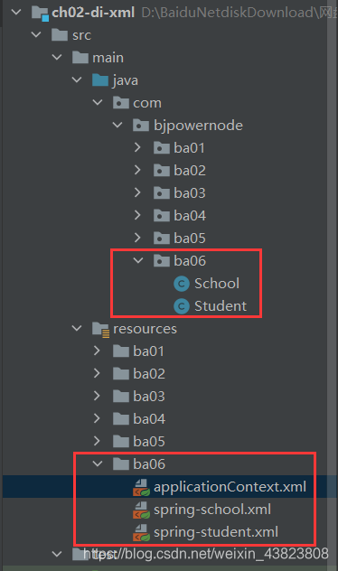 <!-- 当前是总的文件,目的是包含其他多个配置文件,一般不声明bean 语法:<import resource="classpath:其他文件的路径" /> classpath: 表示类路径,spring通过类路径加载配置文件 --> <import resource="classpath:ba06/spring-school.xml" /> <import resource="classpath:ba06/spring-student.xml" /> <!-- 上面两行等价于下面这行 --> <!-- <import resource="classpath:ba06/spring-*.xml" /> -->