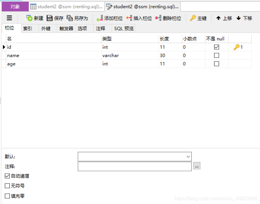 2.2 使用Navicat在数据库中创建一张表student2