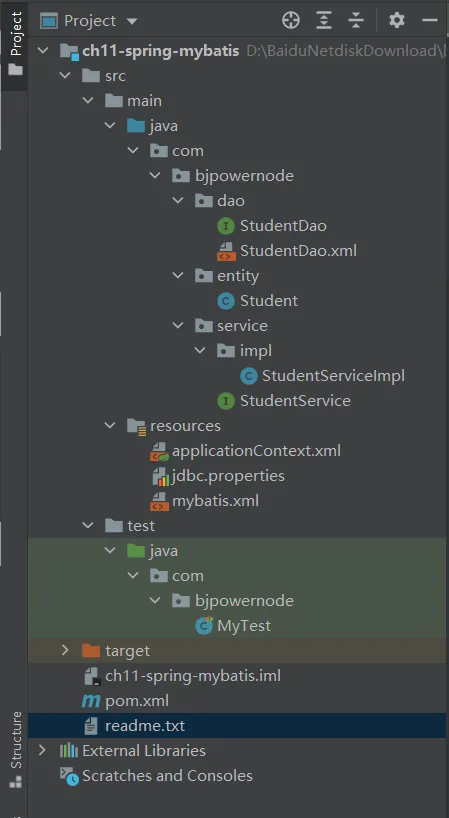 spring集成mybatis,实现步骤: 1.使用mysql数据库,创建学生表student2(id int 自动增长,name varchar(30),age int) 2.创建maven项目 3.加入依赖 spring依赖、mybatis依赖、mysql驱动、junit单元测试 spring-mybatis依赖(mybatis网站上提供的,用来在spring项目中,创建mybatis对象) spring有关事务的依赖 mybatis和spring整合的时候,事务是自动提交的。 4.创建实体类Student 5.创建dao接口和mapper文件,编写其中的sql语句 6.编写mybatis主配置文件 7.创建service接口和它的实现类 8.创建spring的配置文件 1) 声明数据源DataSource,使用阿里的Druid连接池 2) 声明SqlSessionFactoryBean类,在这个类的内部创建SqlSessionFactory对象 3) 声明MapperScannerConfigurer类,在这个类的内部创建dao代理对象,创建的对象放在spring容器中 4) 声明service对象,把3)中的dao赋值给service对象属性 9.测试dao访问数据库