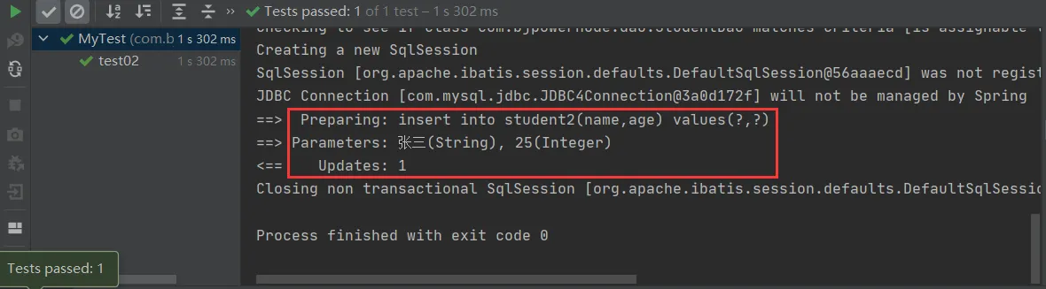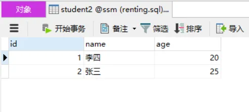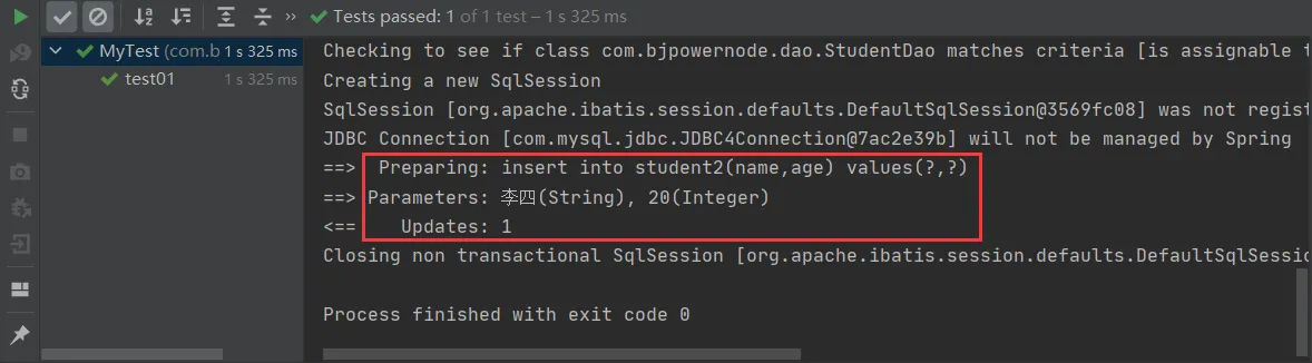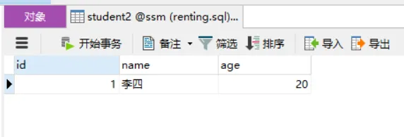 @Test public void test01() { String config="applicationContext.xml"; ApplicationContext ctx=new ClassPathXmlApplicationContext(config); StudentDao studentDao= (StudentDao) ctx.getBean("studentDao"); Student student=new Student(); student.setName("李四"); student.setAge(20); studentDao.insertStudent(student); }