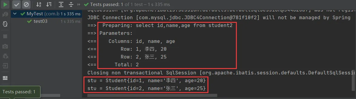 @Test public void test03() { String config="applicationContext.xml"; ApplicationContext ctx=new ClassPathXmlApplicationContext(config); StudentService service= (StudentService) ctx.getBean("studentService"); List<Student> students=service.queryStudent(); for (Student stu : students) { System.out.println("stu = " + stu); } }