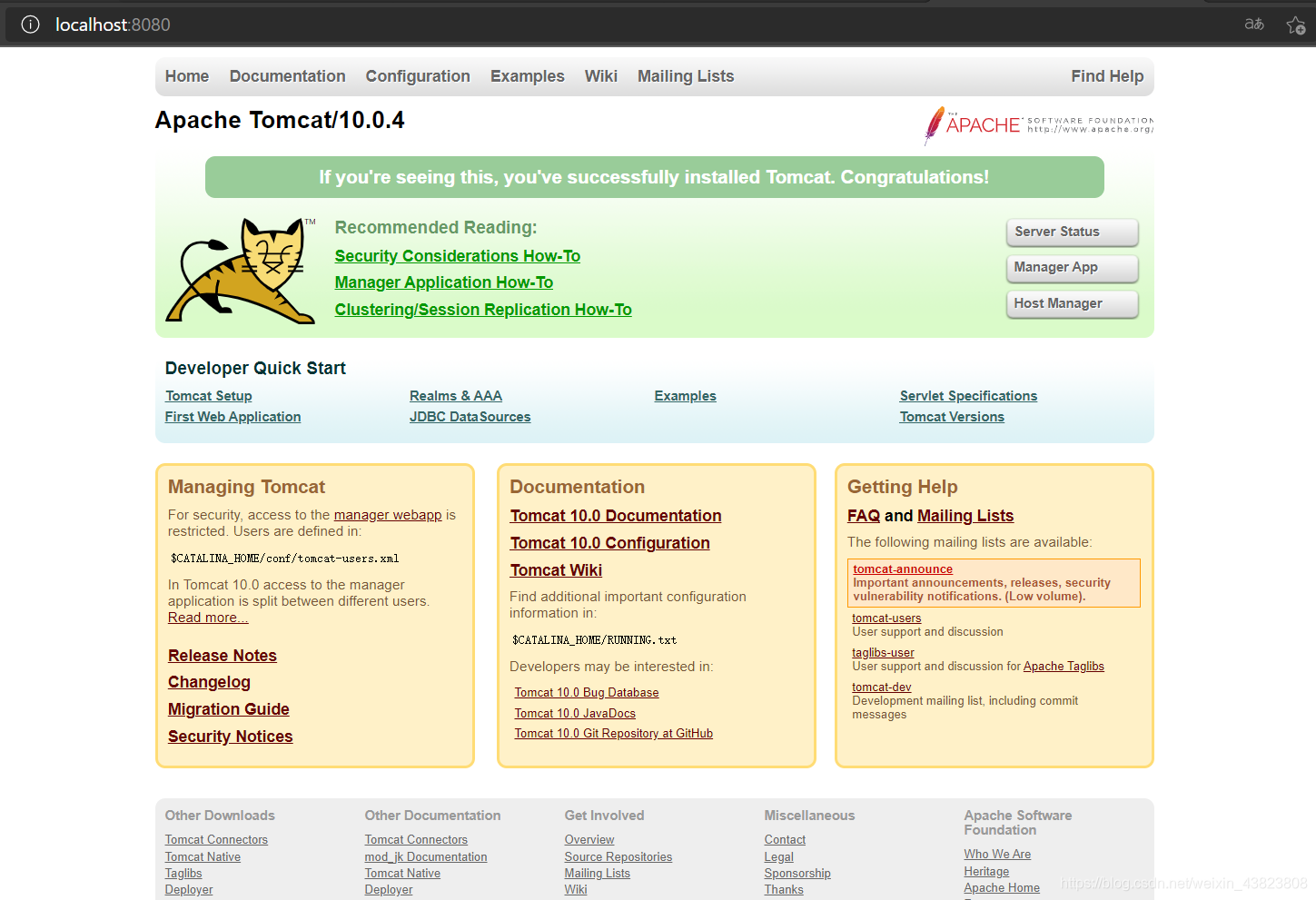 出现上面这样的乱码,不用管这个。打开浏览器输入 localhost:8080,如果出现下面的界面,说明你的JDK环境配置没问题,否则需要重新配置一下环境。