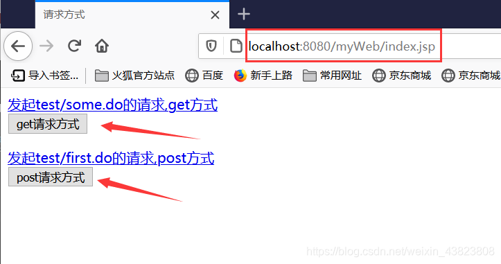 <%@ page contentType="text/html;charset=utf-8" language="java" %> <html> <head> <title>请求方式</title> </head> <body> <a href="test/some.do">发起test/some.do的请求,get方式</a> <br/> <form action="test/some.do" method="get"> <input type="submit" value="get请求方式"> </form> <a href="test/first.do">发起test/first.do的请求,post方式</a> <br/> <form action="test/first.do" method="post"> <input type="submit" value="post请求方式"> </form> </body> </html>