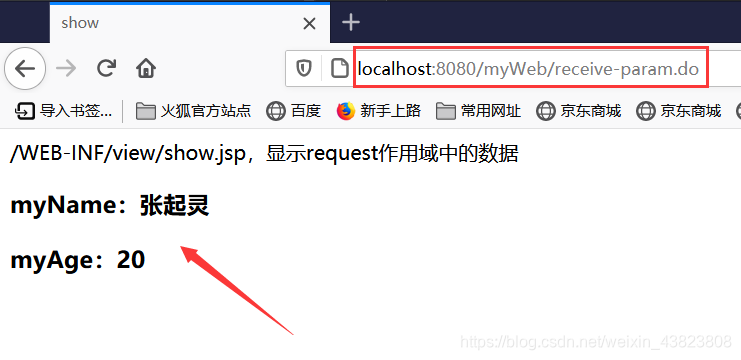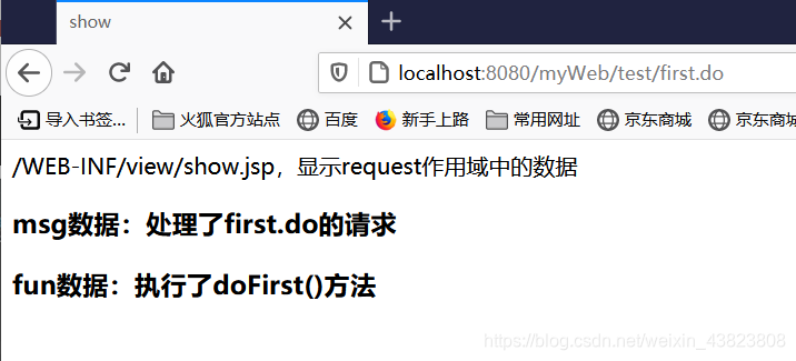 <%@ page contentType="text/html;charset=utf-8" language="java" %> <html> <head> <title>show</title> </head> <body> /WEB-INF/view/show.jsp,显示request作用域中的数据<br/> <h3>msg数据:<%=request.getAttribute("msg")%></h3> <h3>fun数据:${fun}</h3> </body> </html>