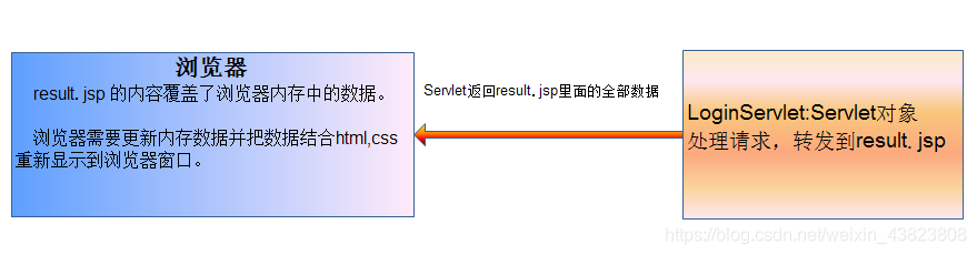 服务器端应答结果阶段:sevlet 返回后把数据全部覆盖掉原来 index 页面内容, result.jsp 覆盖了全部的浏览器内存数据。整个浏览器数据全部被刷新。重新在浏览器窗口显示数据,样式,标签等 。