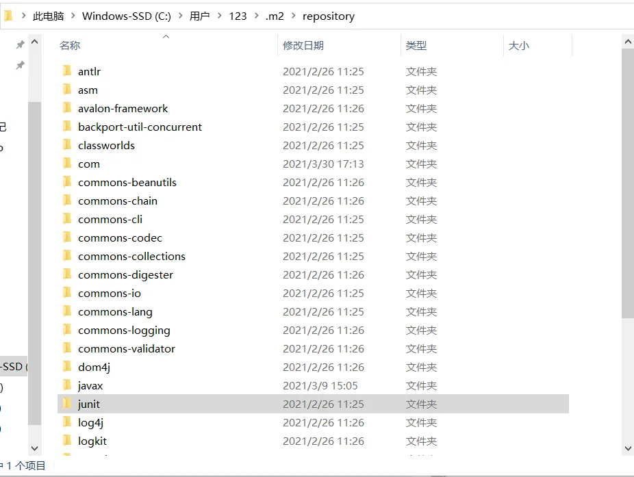 本地仓库默认存放的路径为:C:\Users\123\.m2\repository(里面存放的基本上都是 .jar 架包、各种配置文件)