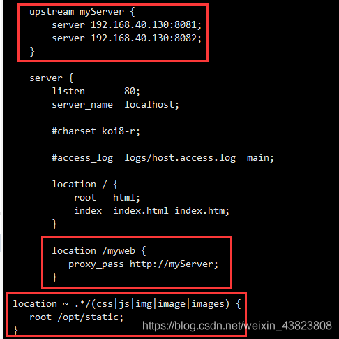 首先,修改nginx.conf文件,在location中配置对静态资源的拦截,如果是静态资源,就交给nginx处理,使拦截静态文件目录的方式。