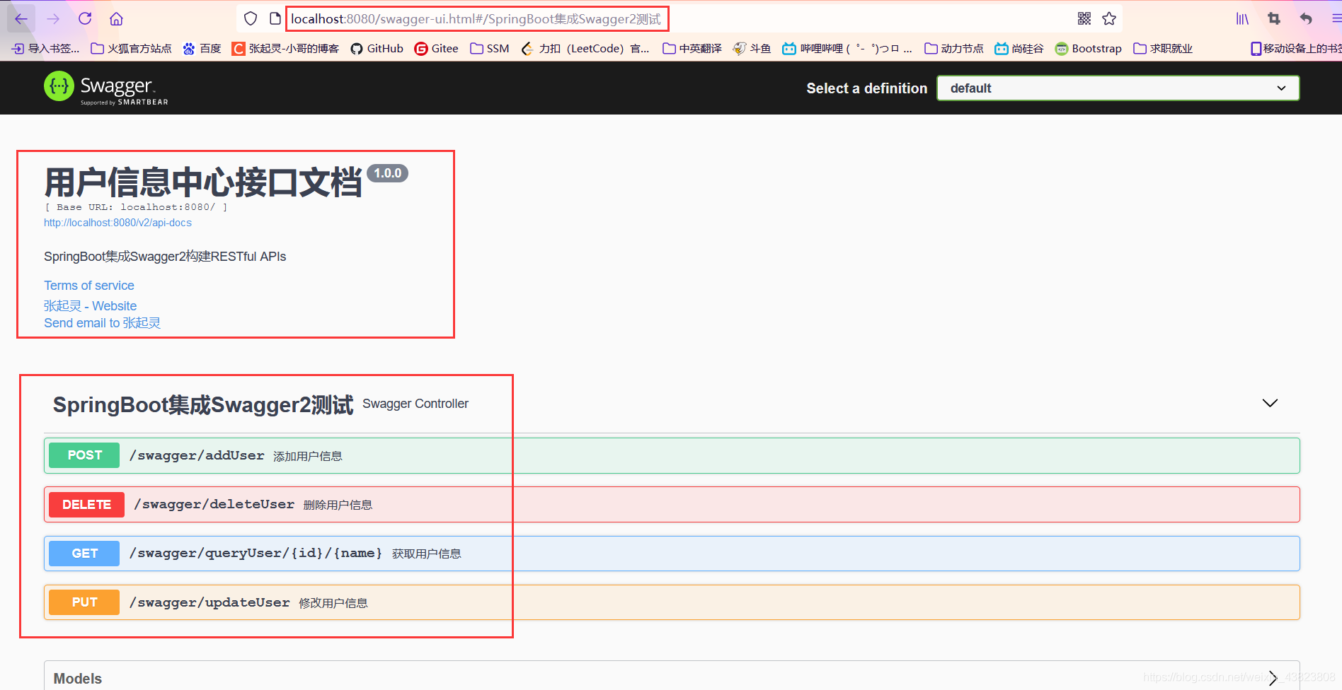 上面几步都完成后,输入这个url访问:http://localhost:8080/swagger-ui.html得到API文档;(如果项目有上下文根,要在端口号的后面加上项目上下文根)