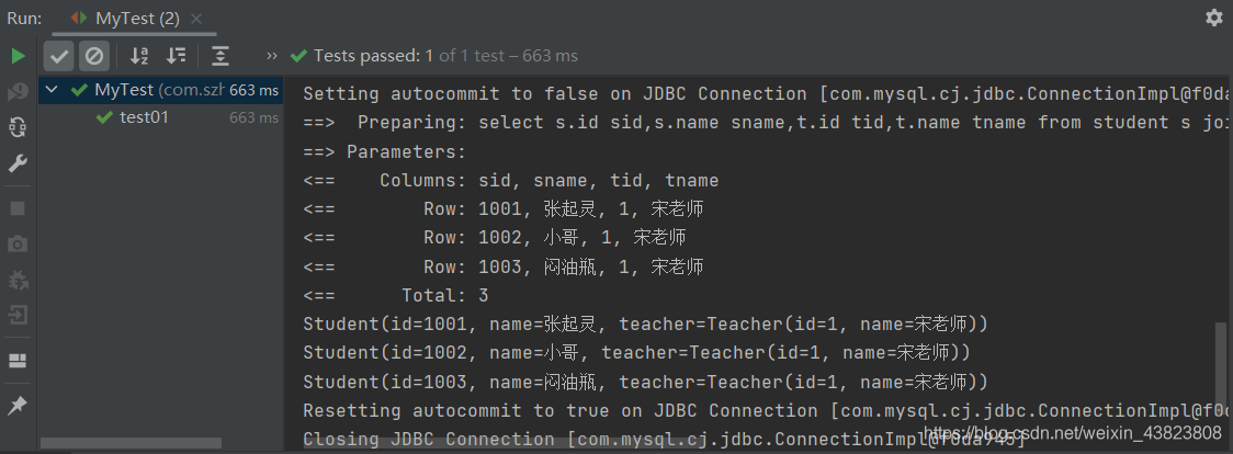 这里就需要做结果集映射了,因为teacher表中的id、name可以顺利查询出,但是我们还需要查询出该老师下的所有学生啊,这是一个List集合,你还能使用<result>???当然不行,这里就需要用到<collection>了,它的property就是我们实体Bean中的属性,ofType则是该property的泛型类型,在它其中,需要定义好映射多方(Student)的一些属性。