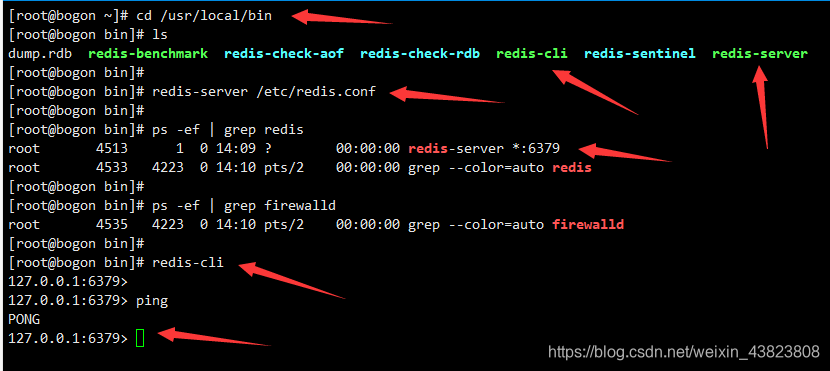 上面的截图是在linux环境下,启动redis的步骤,安装之后redis的启动命令都在/usr/local/bin 目录下,/etc/redis.conf 是redis的配置文件。