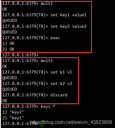 上面的案例,从 multi 开启事务,之后向redis中存入两个key,之后exec 正常执行事务。discard 可以放弃事务的执行。