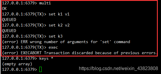 这里multi开启事务,在第三个 set 的时候,出现了错误语法,然后再执行 exec,可以看到事务全部不执行。