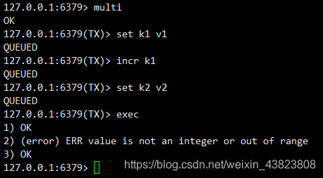 这里multi开启事务,然后组队阶段无任何语法错误,但是我们exec 的时候,可以看到事务命令依次执行,在第二个命令的时候出错了。