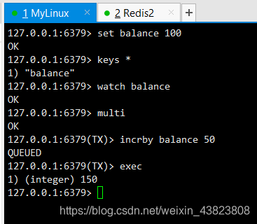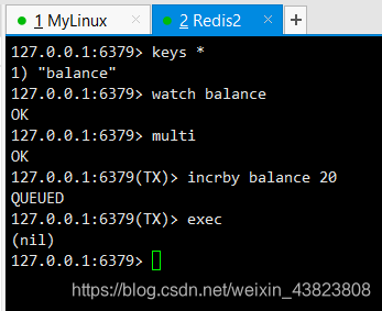 上面的截图,开启了两个redis客户端,这两个redis客户端分别对balance 这个键进行watch监控。