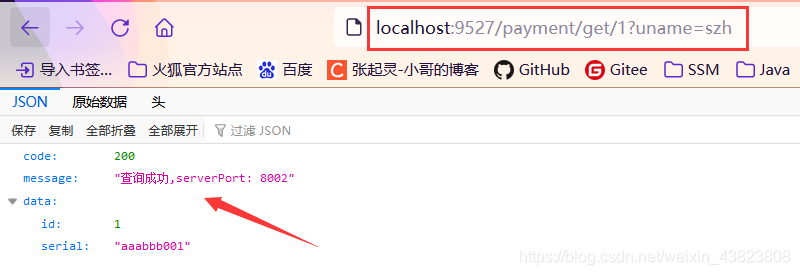 在没有添加网关的时候,我们访问url是:http://localhost:8001/payment/get/1;添加网关之后,url是:http://localhost:9527/payment/get/1?uname=szh