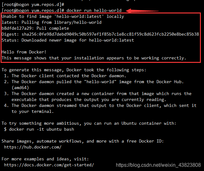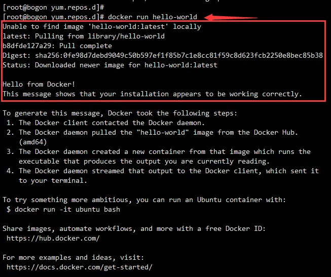 下面进行一个简单的测试,run一下hello world这个镜像。
