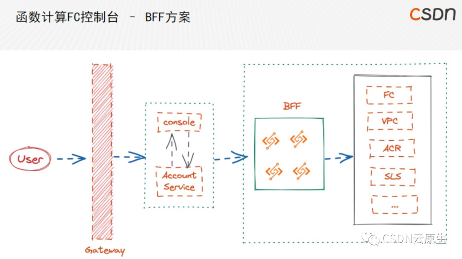 左侧是阿里云通用的网关,负责统一鉴权和安全等逻辑,抽离出 BFF(Backend for Frontend)层,这部分的特点如下: