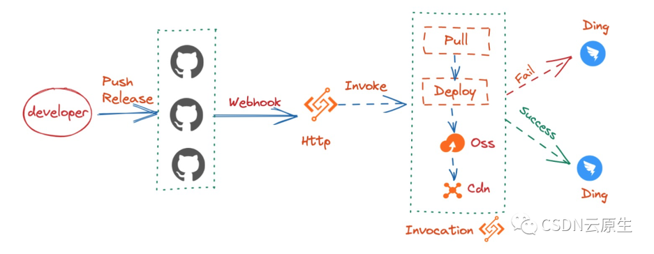 开发者在 GitHub 更新文档,触发 webhook 钩子配置的 Http Serverless 函数。这里需要注意的是:由于组件的文档数目不定以及 GitHub 网络不稳定等问题,如果所有的工作都在 Http 函数中处理,非常容易导致超时,所以将所有的处理逻辑放在异步调用中,执行完后将处理的结果投递到钉钉或者邮件等渠道。