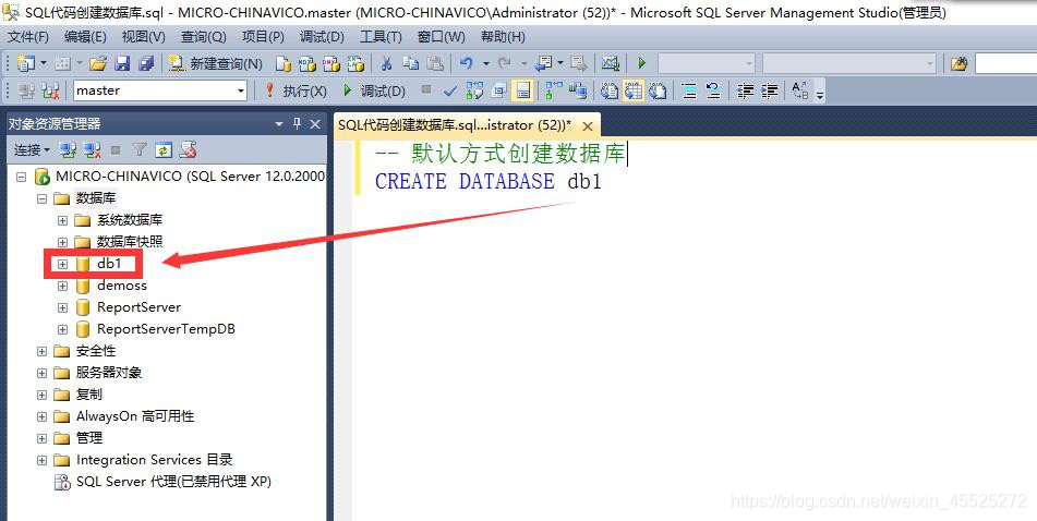 -- 判断数据库是否存在,若存在删除数据库 if exists(select *from sysdatabases where name='std') drop database std -- 创建默认数据库名称 create database std