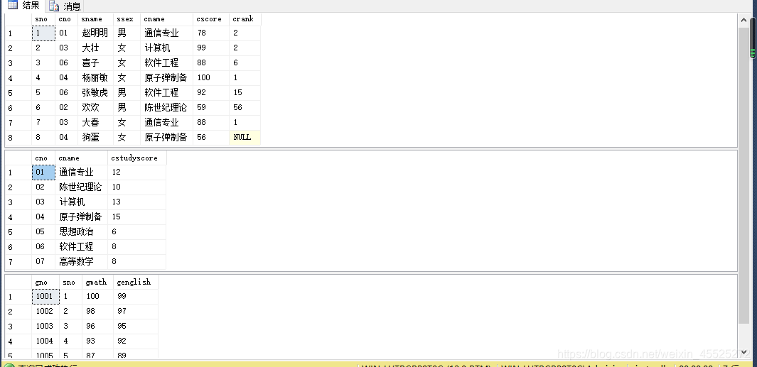 -- 打开数据库 use sixstardb go -- 查询输出:数据表 select *from student select *from course select *from grade go ------------------------------------------------------------------------------------------------ -- 创建视图 -- 先判断创建视图名称是否存在 if exists(select *from sysobjects where id=object_id(N'student_course_grade_view')) drop view student_course_grade_view --删除视图 go -- 创建视图 create view student_course_grade_view as select student.sno,student.sname,student.ssex,course.cno,course.cname,grade.gno,grade.gmath,grade.genglish from student,course,grade where student.cno=course.cno and student.sno=grade.sno go -- 通过视图输出数据 select *from student_course_grade_view go -- 通过视图插入数据 use sixstardb go if exists(select *from sysobjects where id=object_id(N'course_view')) drop view course_view go create view course_view -- 创建课程表视图 as select course.cno,course.cname from course select *from course_view -- 通过视图输出数据 insert into course_view(cno,cname) values('08','模型') --通过视图插入数据 go update course_view set sno='1007' -- 通过视图修改数据 where cno=116 select *from course --查询输出基础表 -- 删除视图 drop view course_view go -- 通过视图删除记录 -- delete ------------------------------------------------------------------------------------------------ -- 索引 use sixstardb go select *from grade create index idx_gscore on grade(gmath) -- 创建索引 select *from idx_gscore drop index grade.idx_gscore --删除索引