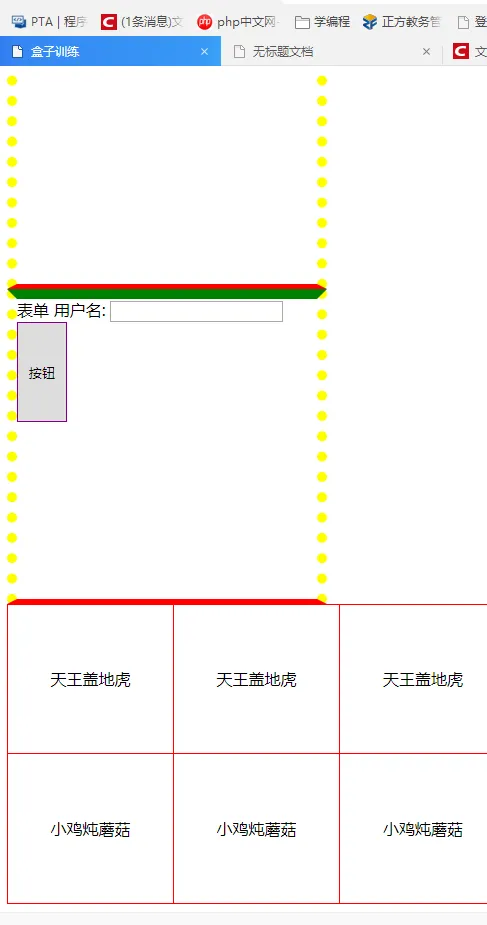 <!DOCTYPE html> <html lang="en"> <head> <meta charset="UTF-8"> <title>盒子训练</title> <style type="text/css"> /* 1. 盒子案例 */ div { width: 300px; height: 300px; border-width: 10px; border-color: yellow; border-style: solid;/*实线*/ border-style: dashed;/*虚线*/ border-style: dotted;/*点线*/ /*border: 1px solid blue;*/ border-top: 10px solid green; border-bottom: 5px solid red; border-left: : 15px solid #daaa; border-right: : 30px dashed yellow; } /* 2.表单边框 */ .inputtest input { border:5px 3px 10px 26px dotted purple ; } .inputtest button { width:50px; height: 100px; border: 1px solid purple; } /* 3. 表格边框 */ table { width: 500px; height: 300px; border: 1px solid red; } td { border: 1px solid red; text-align: center; } table, td { border-collapse: collapse; /*合并相邻边框*/ } </style> </head> <body> <div> 盒子 </div> <div class="inputtest"> 表单 用户名: <input type="text"> <button>按钮</button> </div> <table cellpadding="0" cellspacing="0"> <tr> <td>天王盖地虎</td> <td>天王盖地虎</td> <td>天王盖地虎</td> </tr> <tr> <td>小鸡炖蘑菇</td> <td>小鸡炖蘑菇</td> <td>小鸡炖蘑菇</td> </tr> </table> </html>