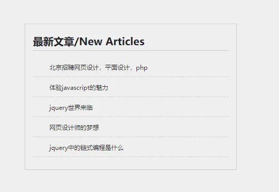 <!DOCTYPE html> <html lang="en"> <head> <meta charset="UTF-8"> <title>Document</title> <style> /*div { width: 100px; height: 100px; border: 2px solid red; padding: 20px; margin: 30px; }*/ * { margin: 0; padding: 0; /*清除内外边距*/ } body { background-color: #eee; } .article { width: 380px; height: 263px; border: 1px solid #ccc; margin: 100px; padding: 20px 15px 0; /*上 20 左右 15 下 0*/ } .article h4 { color: #202026; font-size: 20px; border-bottom: 1px solid #ccc; padding-bottom: 5px; /*margin-bottom: 12px;*/ } li { list-style: none; /*取消li 前面的小点*/ } .article ul li { height: 38px; line-height: 38px; border-bottom: 1px dashed #ccc; /* 1像素的虚线边框*/ text-indent: 2em; } .article a { font-size: 12px; color: #333; text-decoration: none; } .article a:hover { text-decoration: underline; /*添加下划线*/ } .article ul { margin-top: 12px; } </style> </head> <body> <div class="article"> <h4>最新文章/New Articles</h4> <ul> <li><a href="#">北京招聘网页设计,平面设计,php</a></li> <li><a href="#">体验javascript的魅力</a></li> <li><a href="#">jquery世界来临</a></li> <li><a href="#">网页设计师的梦想</a></li> <li><a href="#">jquery中的链式编程是什么</a></li> </ul> </div> </body> </html>