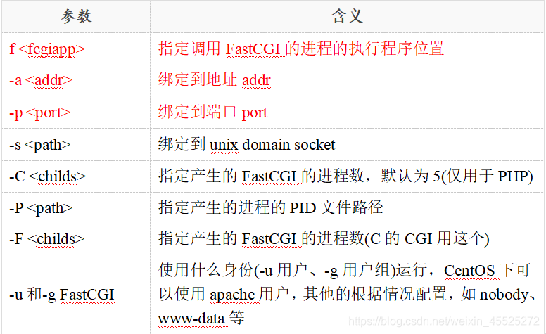 spawn-fcgi的帮助信息可以通过man spawn-fcgi或spawn-fcgi -h获得,下面是部分常用