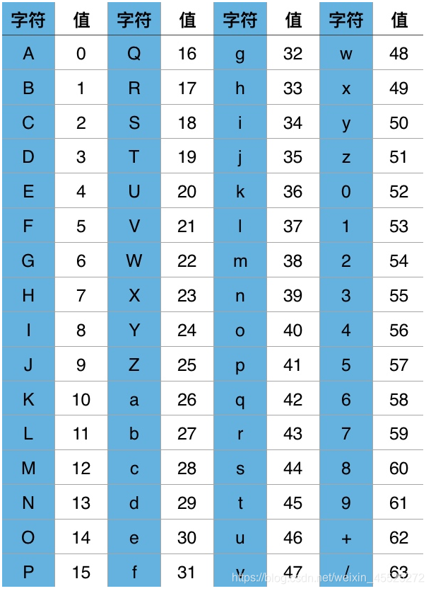 - 如果剩下的字符不足3个字节,则用0填充,输出字符使用’=’,因此编码后输出的文本末尾可能会出现1或2个’=’, 表示补了多少字节,解码的时候,会自动去掉。
