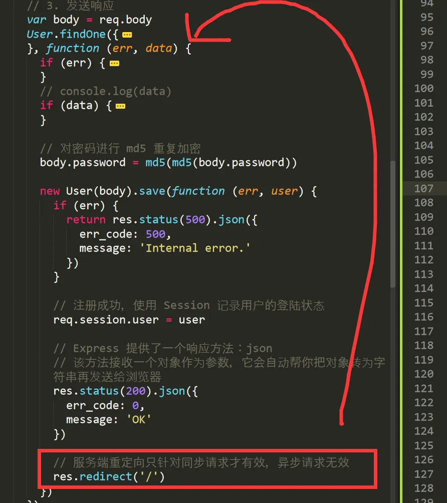 当我们在服务端的 异步请求 中重定向是无效的,例如: