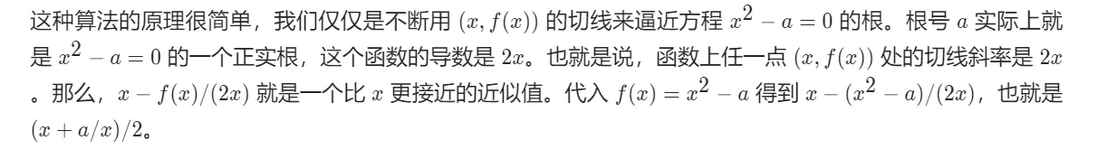 下面这种方法可以很有效地求出根号 aa 的近似值:首先随便猜一个近似值 xx,然后不断令 xx 等于 xx 和 a/xa/x 的平均数,迭代个六七次后 xx 的值就已经相当精确了。