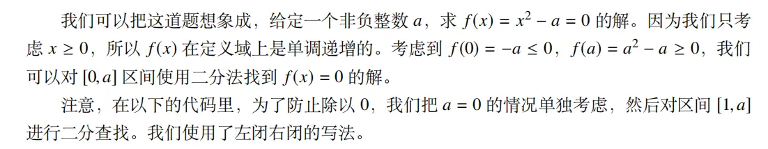 int mySqrt(int a) { if (a == 0) return a; int l = 1, r = a, mid, sqrt; while (l <= r) { mid = l + (r - l) / 2; sqrt = a / mid; if (sqrt == mid) { return mid; } else if (mid > sqrt) { r = mid - 1; } else { l = mid + 1; } } return r; }