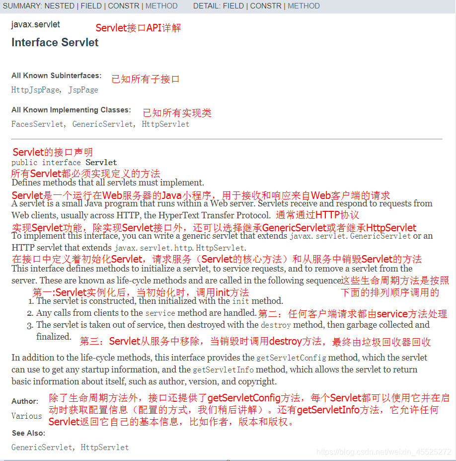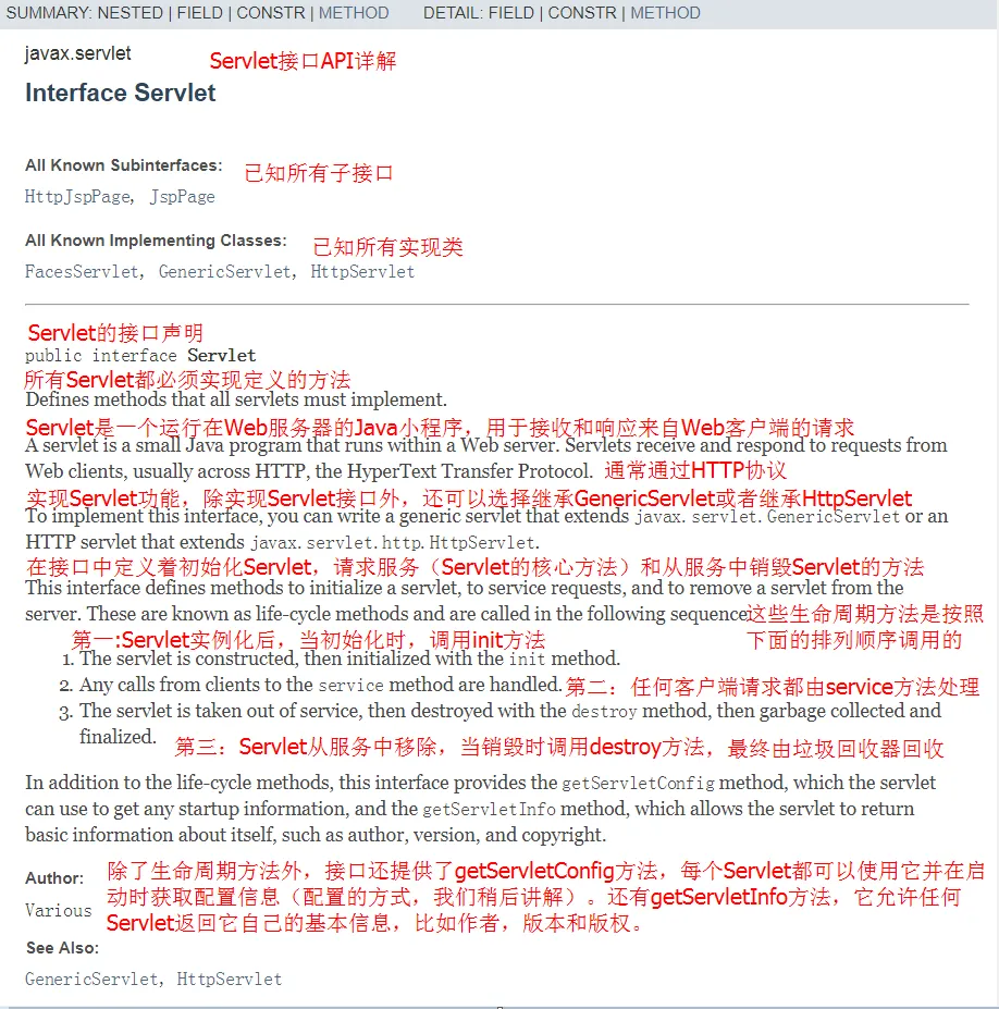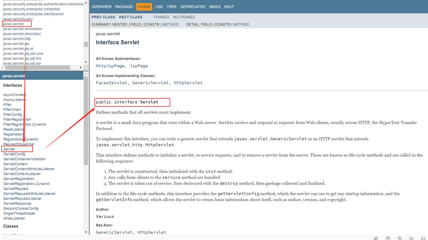 打开官方API网址,在左上部分找到javax.servlet包,在左下部分找到Servlet,如下图显示: